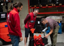 „Z evropského projektu Potravinová a materiální pomoc nejchudším osobám III dostáváme palety potravinové nebo hygienické pomoci o hmotnosti 500 až 900 kilogramů,“ vysvětluje Vojtěch Pezlar. „Jeden člověk prakticky není schopný takovou paletu na ručním vozíku utáhnout sám. Pokud má z jednoho závozu přemístit 30 takových palet, pak se z toho týden nemůže hýbat. Z kapacitních důvodů zároveň nejde, aby jednu paletu vždy tahali dva lidé. Bylo to velice náročné,“ shrnuje období, kdy si musel vystačit s vlastní silou. Dar od předního distributora manipulační techniky z Brna však práci ve skladu nesmírně ulehčil. Přemístění téměř tunové palety, i po ne zcela hladkém povrchu, s ním lze zvládnout doslova jednou rukou. „Teď se na závoz těžkých palet člověk těší,“ pochvaluje si Vojtěch Pezlar.