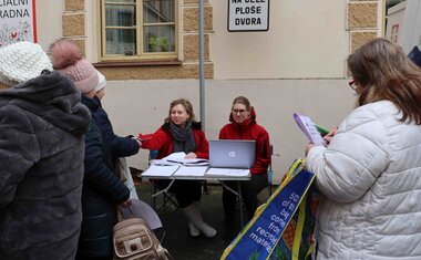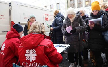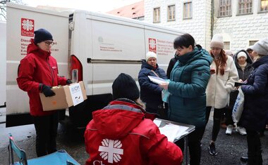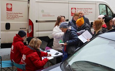 S ohledem na přepravní možnosti těchto lidí, využíváme také charitní dodávku. Před poskytnutím pomoci vždy provádíme sociální šetření zaměřující se na skutečnou potřebnost uprchlíků. Fotografie jsou z výdeje pomoci v Klatovech před Sociální poradnou Klatovy, provozovanou Oblastní charitou Klatovy. Naše dodávka zavezla potraviny také uprchlické komunitě ve Zbůchu a na několik míst v Plzni, zejména seniorům, kterým by přeprava břemene činila fyzické obtíže. V Plzni je tato mimořádná potravinová pomoc vydávána v pondělí a ve čtvrtek od 9 do 14 hodin v areálu Diecézní charity Plzeň na adrese Cukrovarská 16.