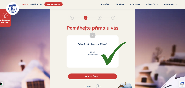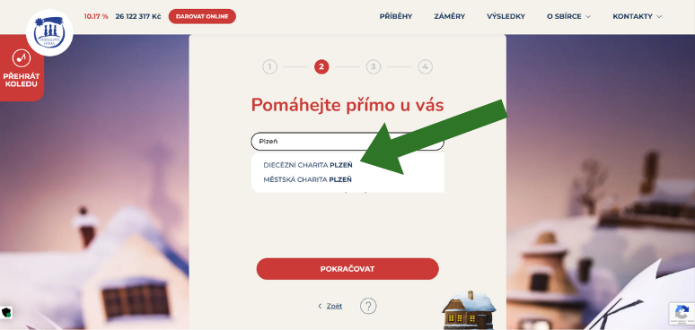 2. V online kasičce vyplňte Plzeň (nebo PSČ 32600) a z výběru pak